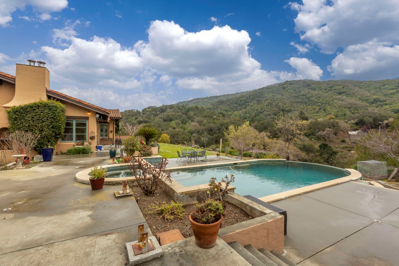 Fantastic Equestrian and car lovers dream hilltop Mediterranean estate in the prestigious Kennedy Estates neighborhood of Los Gatos, Ca. Situated on 4.83 lot. The main house sits atop the hillside property offering great views for the Los Gatos foothills. The property has a 1,200 square foot detached shop with an oversized garage door and a full bathroom. Two additional 2 car garages and a covered workshop space. Below the main house is a horse stable, a horse rink with plenty of pasture space below.The spacious and expansive residence has 5 bedrooms with en-suite bathrooms, 2 half bathrooms and 8,085 square feet. Home includes a wine cellar, an office/den, large living and family rooms, formal dining, a massive butler's pantry and a private deck off the primary bedroom. The gourmet kitchen has a 6 burner gas stove, duel ovens, built in refrigerator, a warming drawer, wine refrigerator within a massive kitchen island. The back yard has an infinity pool with connected spa. Come and see!